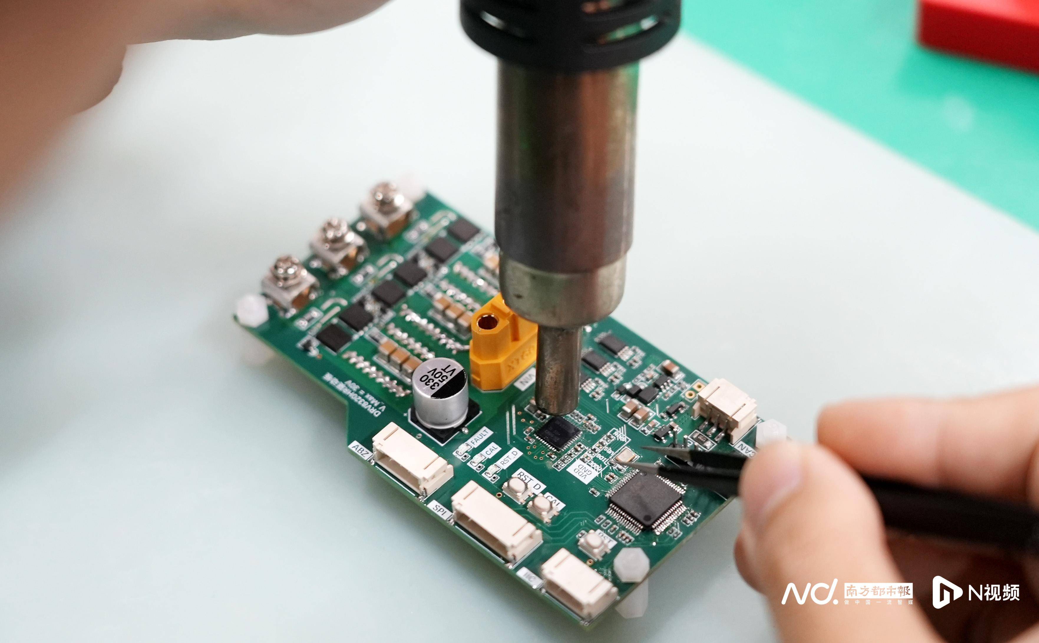 焊接台(tai)上,绿色的(de)电路板被密密麻麻的(de)电子元器件覆盖,细密的(de)铜线如神经收集般交错延长。黄健彬右手握着热风枪(qiang),左手轻轻用镊子固定一枚指甲盖大小的(de)芯(xin)片。跟着一缕青烟升起,两秒钟后,芯(xin)片被牢固焊接在电路板上。