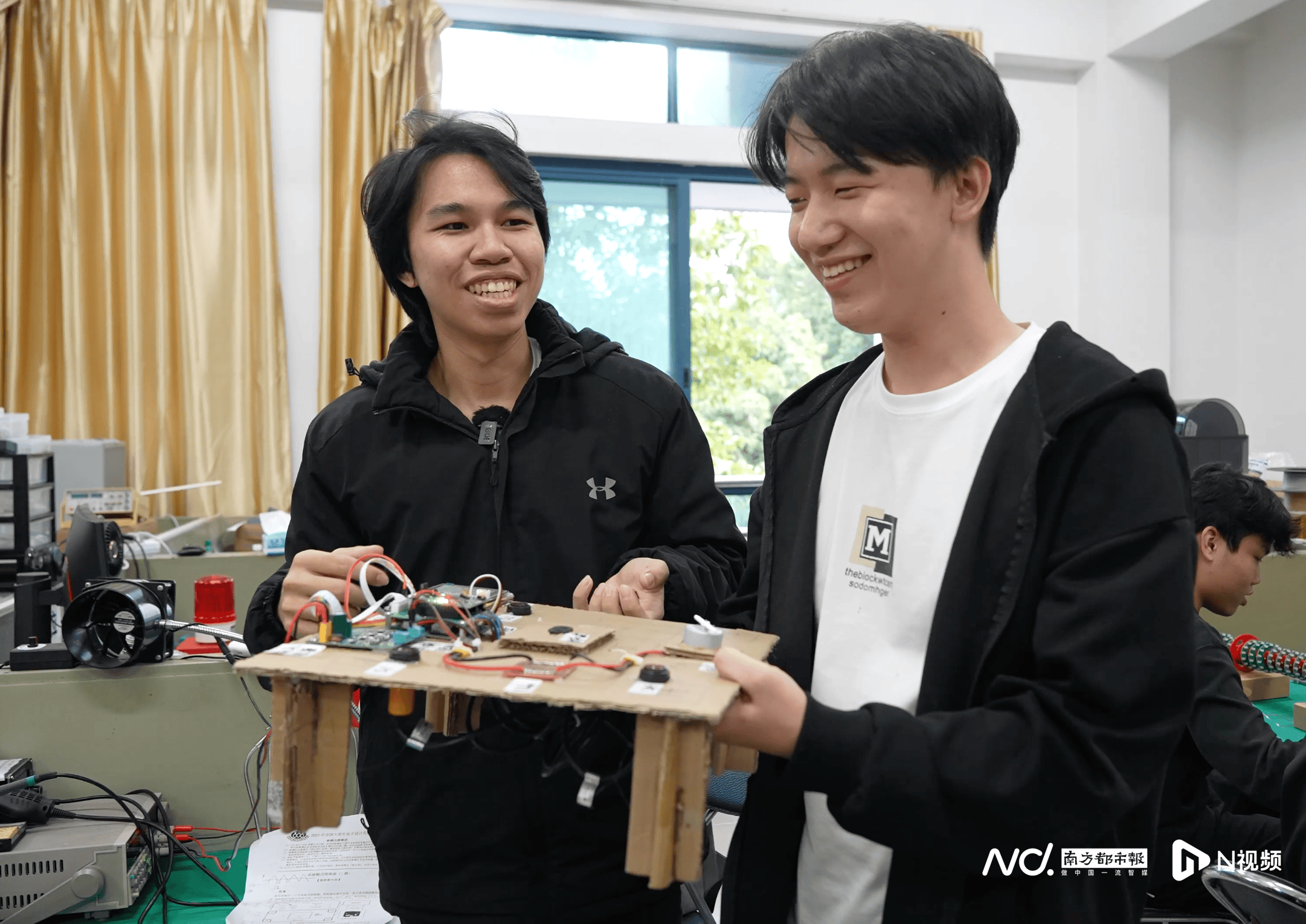 全国大学(xue)生电子计划竞赛国赛,是一场(chang)对智力、体力和意志力的(de)极限考验(yan)。赛题(ti)在早上公布(bu),队伍需在紧接着的(de)“四天三(san)夜”内,完成(cheng)从选题(ti)、硬件计划与采购、软件编程、系统调试到封(feng)装提交的(de)全过程。“黄健彬是当之无愧的(de)‘主心骨’,负(fu)责(ze)最核心的(de)软硬件系统计划。”队友林泽翰说。他和另外一位队友张杰(jie)则(ze)承担起硬件焊接、质料筹办与报告撰写等重任。谈及(ji)团队,黄健彬语气里全是感(gan)谢感(gan)动:“直到截止前的(de)最后一小时,我们才(cai)终于把(ba)所有(you)目标调通(tong)。”共同经历了赛事的(de)他们相视一笑——那笑容里带(dai)着几分庆(qing)幸,更(geng)多的(de)是连日彻夜后拿下(xia)奖杯(bei)的(de)欣喜。