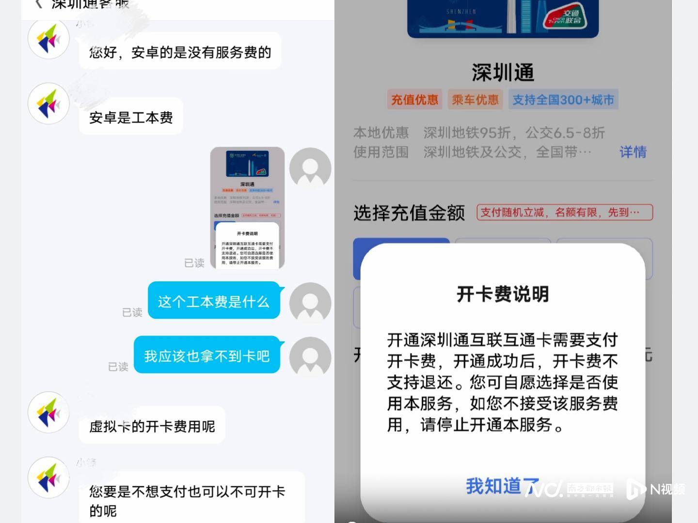 正在王女士与(yu)深圳通客服(fu)的聊天截图中,该客服(fu)曾表示,苹果手机的开卡服(fu)务费可退还,而(er)国产安(an)卓手机并无服(fu)务费,其假(jia)造卡的开卡费用为工(gong)本(ben)费,支付后(hou)不予退还,若不想支付也可不开通深圳通互联互通卡。