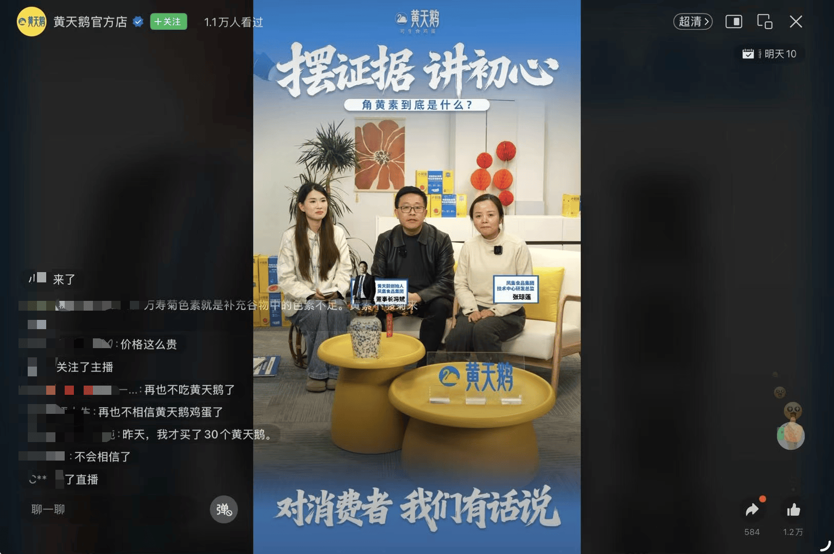 黄天鹅创始人(ren)冯斌(中)直播回(hui)应角黄素(su)争议(yi)。 黄天鹅官方店直播截图
