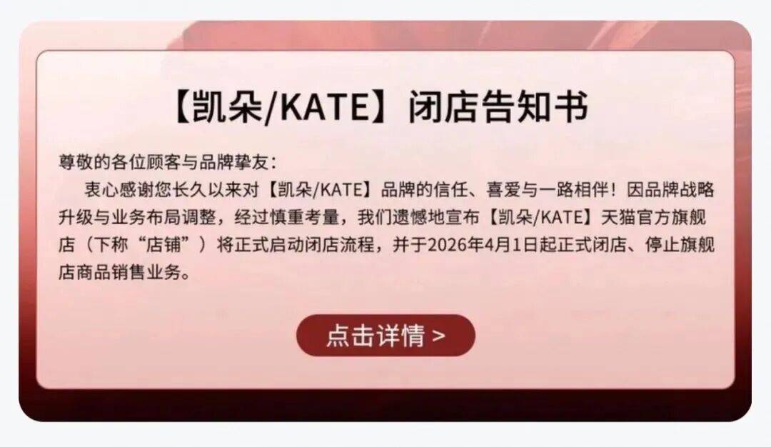 近日,花王团体旗下典范彩妆品牌KATE凯朵,接连在抖音官方旗舰店、天猫官方旗舰店公布闭店告知书,宣告店铺将于2026年4月1日起正式闭店。